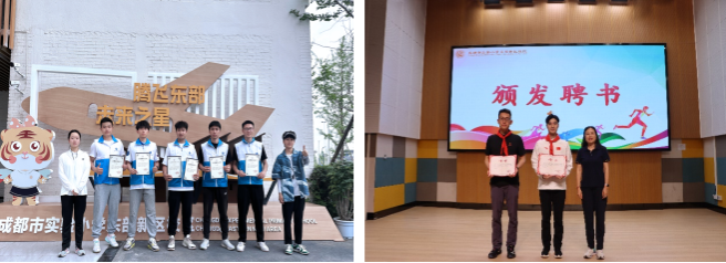 成都实验小学东部新区校区体育组领导对我院师生志愿者在运动会中的服务给予高度认可,为我院志愿者颁发证书并合影留念。通过本次活动,我院志愿者们不仅将自己的专业知识融入到志愿服务当中,也再次为今年会官方网站与成都实验小学东部新区校区进行长期、多维度的深度合作奠定良好基础。