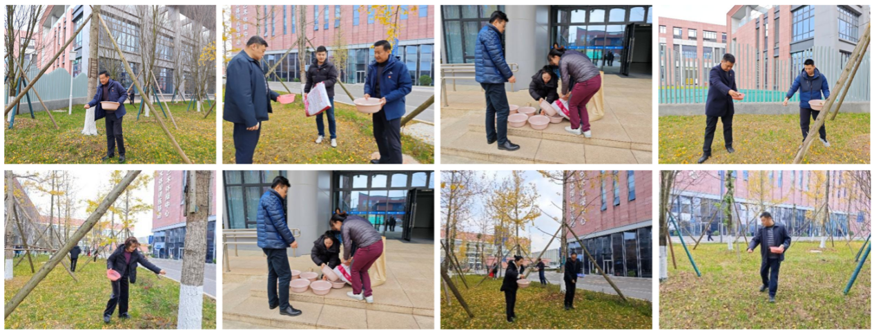 在运动休闲馆前,党员教师们围绕校园绿植养护开展集中劳动实践。学院党委精心谋划、周密部署,付东副校长以普通党员身份参加活动,与大家一道认领责任区、修剪枝叶、翻整花土、施肥浇灌。短短一个中午时段,原本略显杂乱的