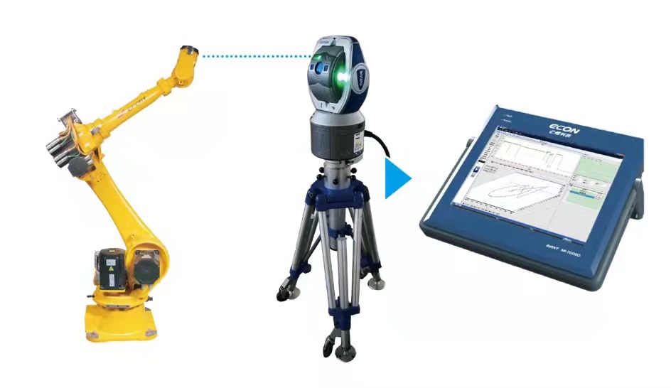 机器人性能检测校准,通过高精度激光跟踪技术及智能标定算法,实现机器人性能高精度、大范围、无接触式的检测,并通过智能算法对其性能进行校准。