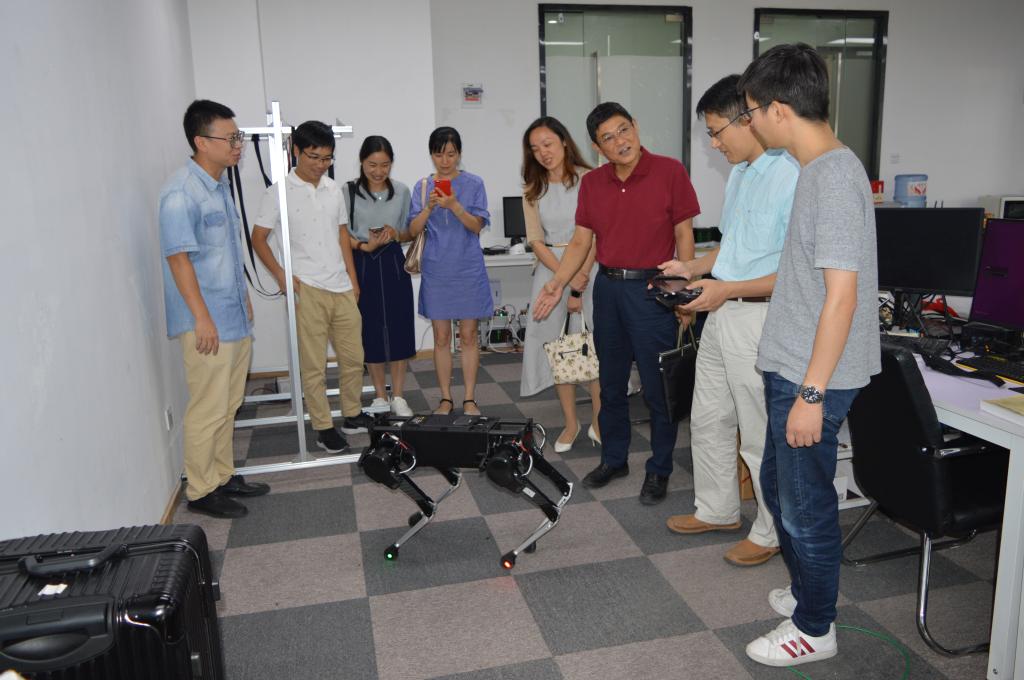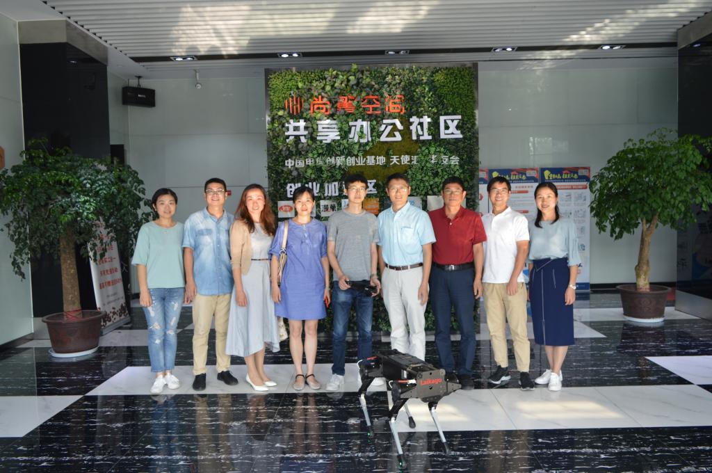 首先,在王兴兴校友的陪同下,潘海鹏一行参观了公司的研发部门及公司备受关注的Laikago四足机器人“网红产品”。王兴兴介绍,这款四足机器人具有强劲的动力性能和运动稳定性。Laikago整机有12个高性能电机,总瞬时最大功率为18KW,功率质量密度0.8KW/Kg,已经可以实现基本上下坡草地、简单的平衡功能并保证运动的稳定性。王兴兴通过设计电机、驱动器及整套控制系统和部分传感器,大大提高了机器人集成度。保证它能在复杂情况下都有保持良好的稳定性。当提到为什么从大疆离职投身创业时。王兴兴谈到因为自己从小就喜欢科技,在研究生期间独立设计的XDog正好被国内外媒体广泛报道,于是就在2016年8月离职,创立了宇树科技。之后从尺寸、体型、动力性能规划出发,按设计需求全新独立研发了电机、电动驱动及主控、整机机械结构以及全新重构的控制系统,打造了全新的四足机器人“Laikago”。