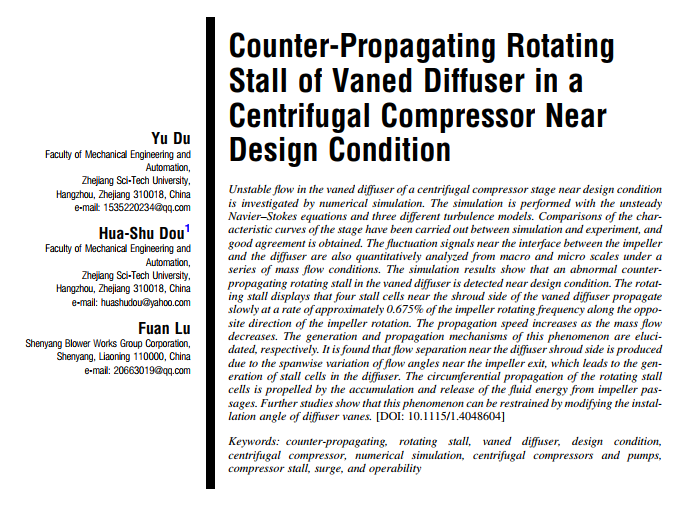 近期,亚博官网硕士研究生杜昱同学以第一作者身份在国际著名期刊《ASME Journal of Turbomachinery》发表长达19页(双栏)的研究论文,论文题目Counter-Propagating Rotating Stall of Vaned Diffuser in a Centrifugal Compressor Near Design Condition(离心压缩机近设计工况叶片扩压器的反向传播旋转失速),通讯作者为导师窦华书教授。