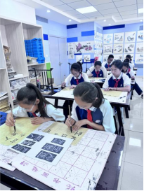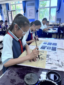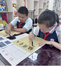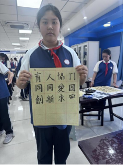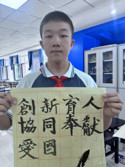 到了自由书写环节,同学们热情高涨,纷纷拿起毛笔,选择自己喜爱的科学家精神主题词语进行书写。“爱国”“创新”“奉献”“求实”……一个个充满力量的词语,在同学们的笔下逐渐成型。有的同学书写刚劲有力,尽显豪迈之气;有的同学书写温婉细腻,流露出对科学家精神的独特感悟。在书写过程中,同学们不仅锻炼了自己的书法技能,更将科学家精神深深地烙印在了心中。最后李家乐对同学们的书法作品进行点评,并预祝同学们“六一”儿童节快乐。