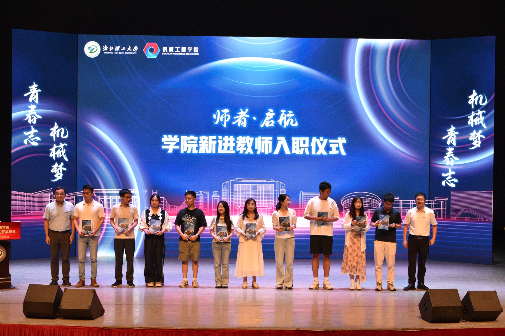 苏志俭、李秦川为新进教师颁授《生存手册》与校徽。《生存手册》凝聚着学院对新教师的关怀与指导,校徽则象征着身份的认同与责任的传承——新教师们接过的不仅是一份手册、一枚校徽,更是“为党育人、为国育才”的使命担当,他们将以全新身份融入浙理机械大家庭,为学科发展与人才培养注入新活力。